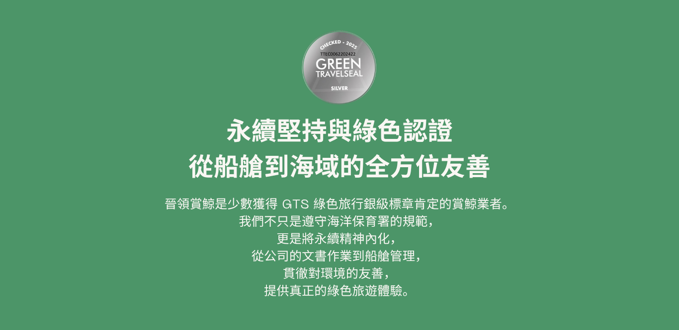 永續堅持與綠色認證:從船艙到海域的全方位友善,晉領賞是少數獲得GTS綠色旅行銀級標章肯定的賞鯨業者。我們不只是遵守海洋保育署的規範,更是將永續精神內化,從公司的文書作業到船艙管理,貫撤對環境的友善,提供真正的綠色旅遊體驗。#台東慢旅