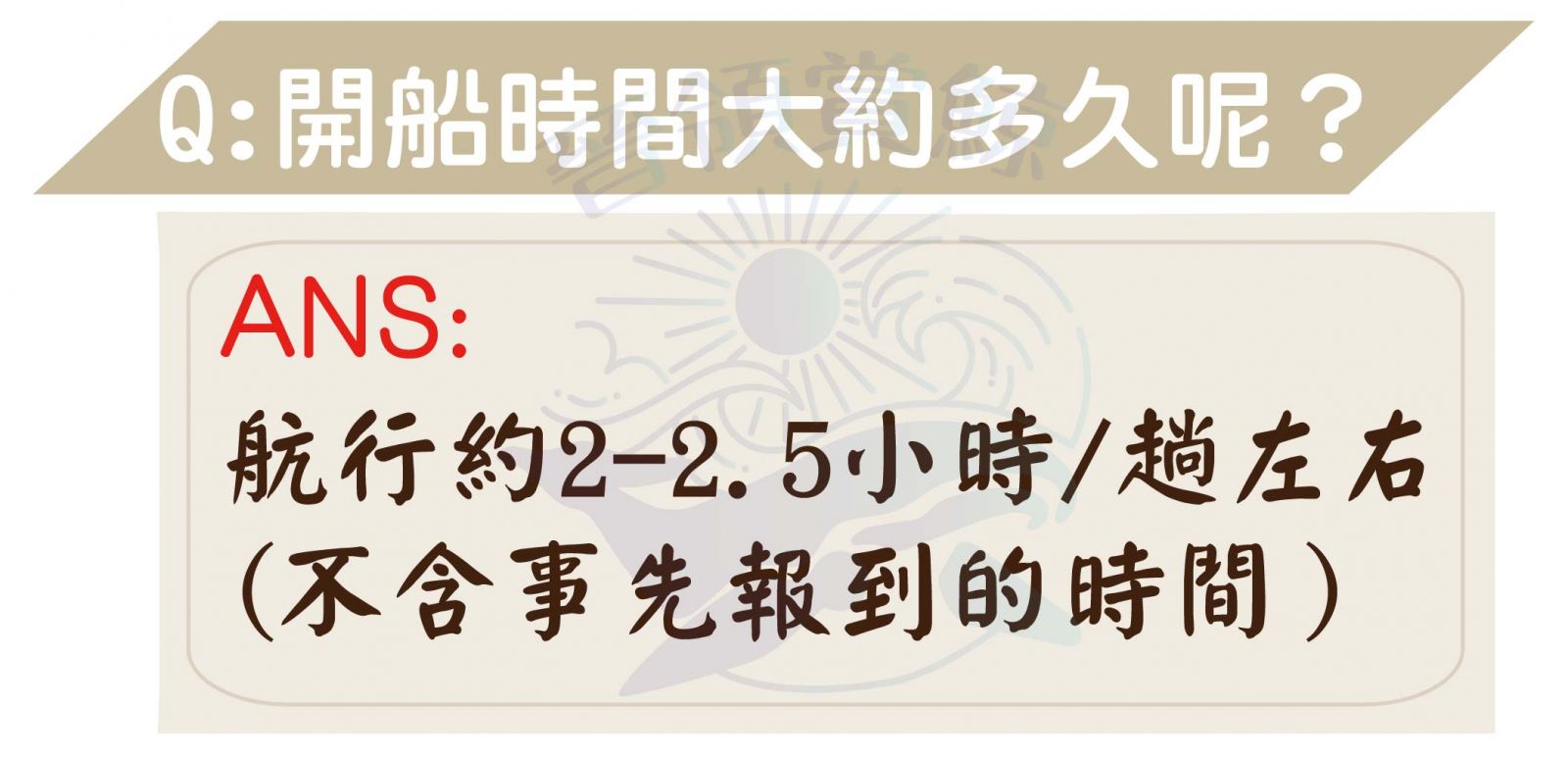 因海流影響,航行時間可能為 2~3 小時左右(不含事先報到的時間),建議行程不要安排太緊,以免影響後續規劃。